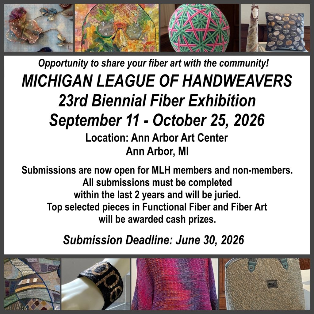 Eligibility: Michigan League of Handweavers members and non-members are invited to submit up to three original entries in Fiber Art and/or Functional Fiber Art categories. No size restrictions. All submissions must be completed within the last two years. All works previously displayed at Michigan League of Handweavers Exhibits are ineligible.