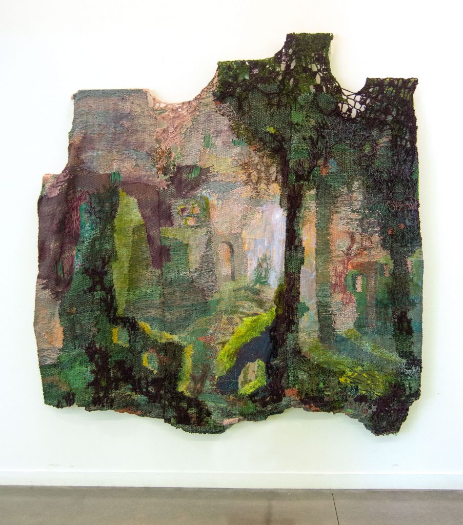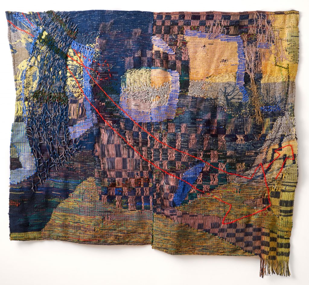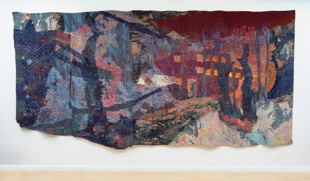 With Building Woven Landscapes, interdisciplinary textile artist Maris Van Vlack will provide insight into her artistic practice of creating woven and knitted landscape tapestries using floor looms and jacquard looms. Van Vlack is an interdisciplinary artist who uses weaving to build images of architectural spaces that explore themes of time and memory. She will talk about her inspirations, the development of her process, and the way that she creates her work by combining tapestry, jacquard, industrial knitting, and paint. Much of her visual inspiration comes from architecture and geology, and she will describe how traveling to places such as Hawai’i and Iceland has influenced her work. She often combines many different ways of working within one piece, and will break down her process of using techniques such as warp printing, double weave, jacquard, and surface knitting, and how all those things can be interwoven to create a cohesive image.