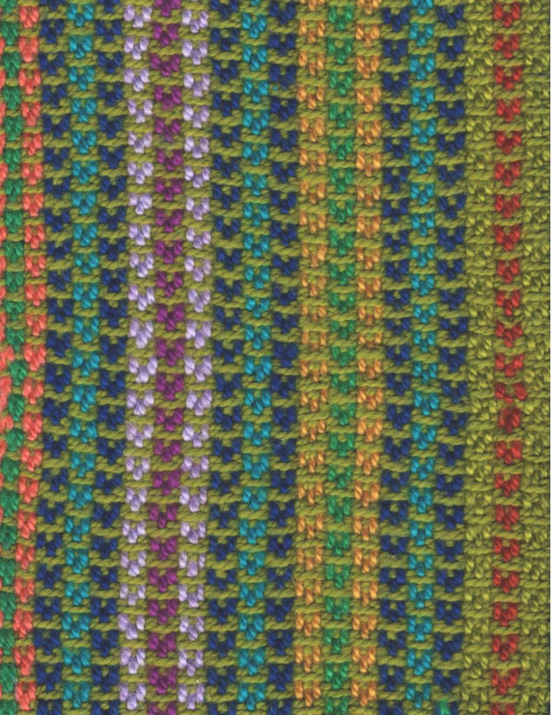 The color and weave draft produces a two sided fabric, one side light, the other dark. Both sides feature a vertical stripe that could be emphasized or lessened according to your color choices. A monochromatic palette, high contrast yarn, even solids vs spaced dyed. Also, a great stash buster for those cones with limited yardage.