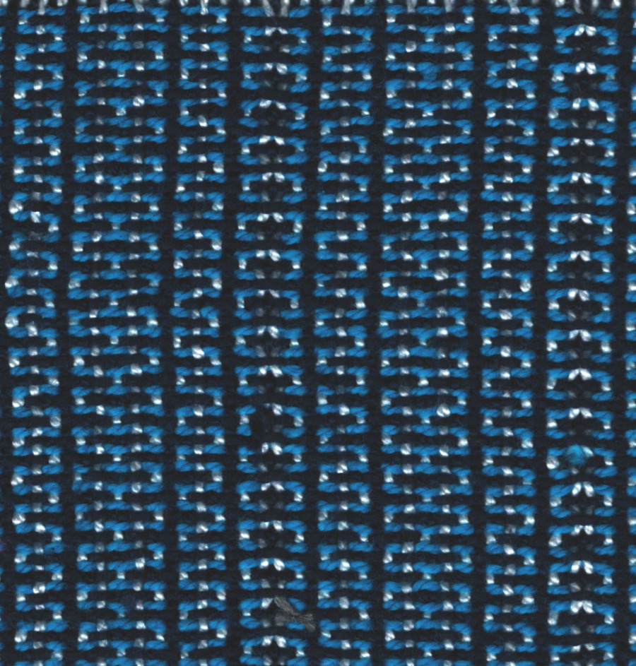 This Guild provides us with a fascinating study woven using Tencel and bamboo. Members chose to compare a “Star of Bethlehem” pattern done as regular overshot to one done in shadow weave for their swatch. They altered the tie-up for a jack loom twill treadling. The shadow weave was woven by throwing a regular pattern shot followed by a shot thrown consistently either one shed higher or lower than the pattern shot. After sampling the treadling order was finessed to produce balanced patterns.